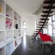 De vergaderruimte heeft naast presentatie ruimte ook een bieb/ hang-out functie, die gescheiden wordt door een vrijstaande presentatiewand / boekenkast.