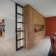In de compacte badkamer van de bovenwoning is een efficiënte indeling bedacht en zijn een op maat gemaakte betonnen was- en douchebak toegepast. Door de betonnen elementen te combineren met hout ontstaat er een evenwichtig geheel. In de slaapkamer is het lage gedeelte van de kastenwand gecombineerd met de achterwand van het bed waardoor er een scheiding ontstaat tussen slapen en opbergen.